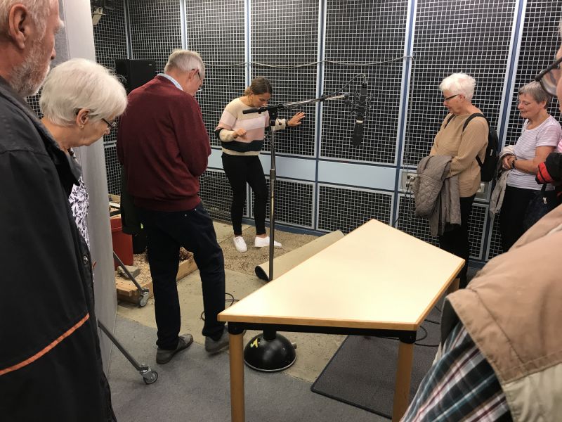 Anschließend besuchten wir das Hörspielstudio. Wie uns berichtet wurde, hat die Hörspielproduktion einen großen Anteil am Radioprogramm. Für sehbehinderte Menschen ist das Hörspiel besonders wichtig, da sie auch die Geräusche differenzierter wahrnehmen. Es gibt zwar ein großes Archiv an Geräuschen, trotzdem müssen sie von den Schauspielern teilweise selber erzeugt werden. Der Protagonist muß z.B. vom Schlafzimmer über den Flur ins Bad gehen. So läuft er über Teppichboden, Laminat und Fliesen.